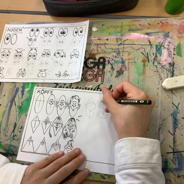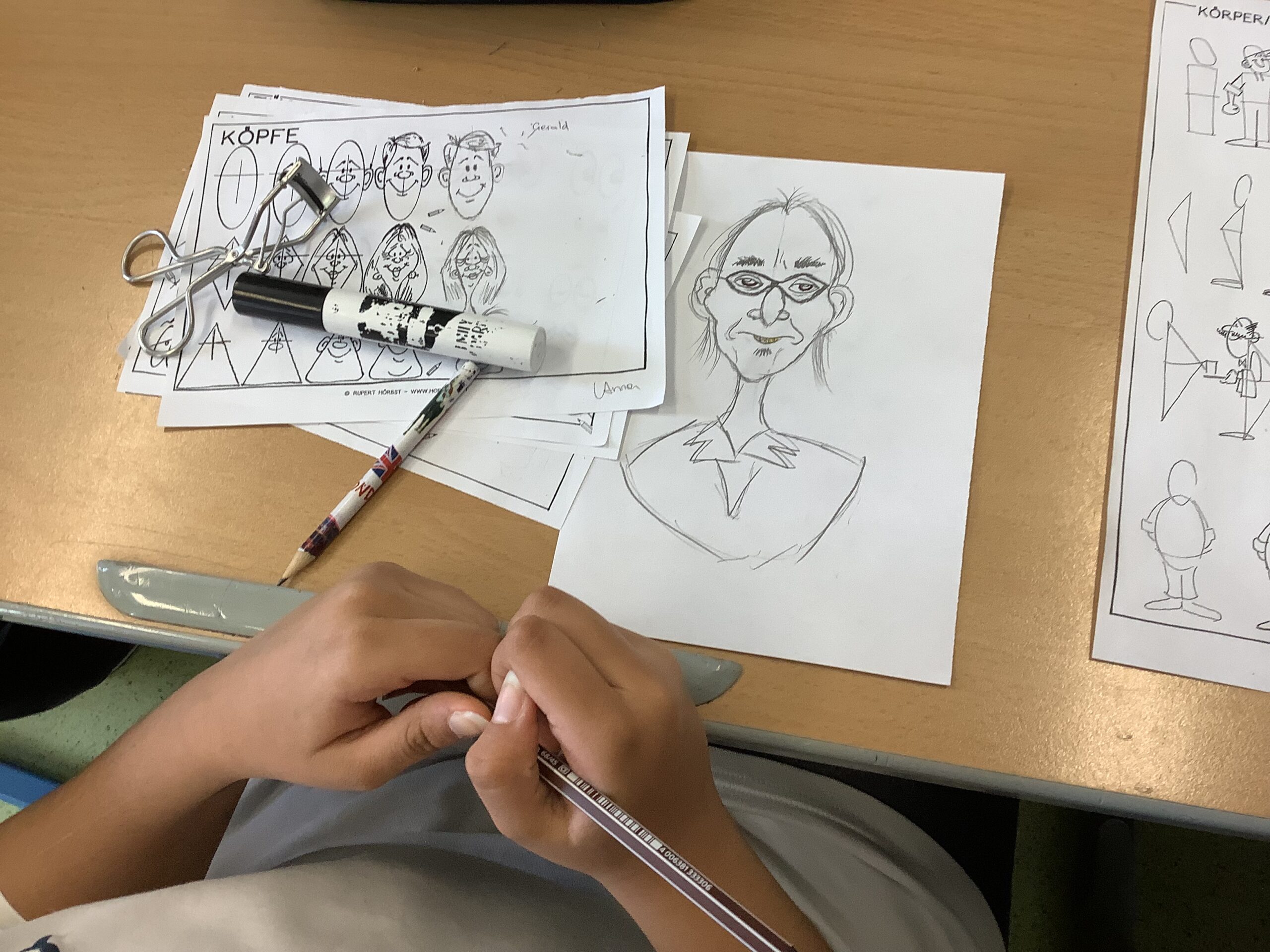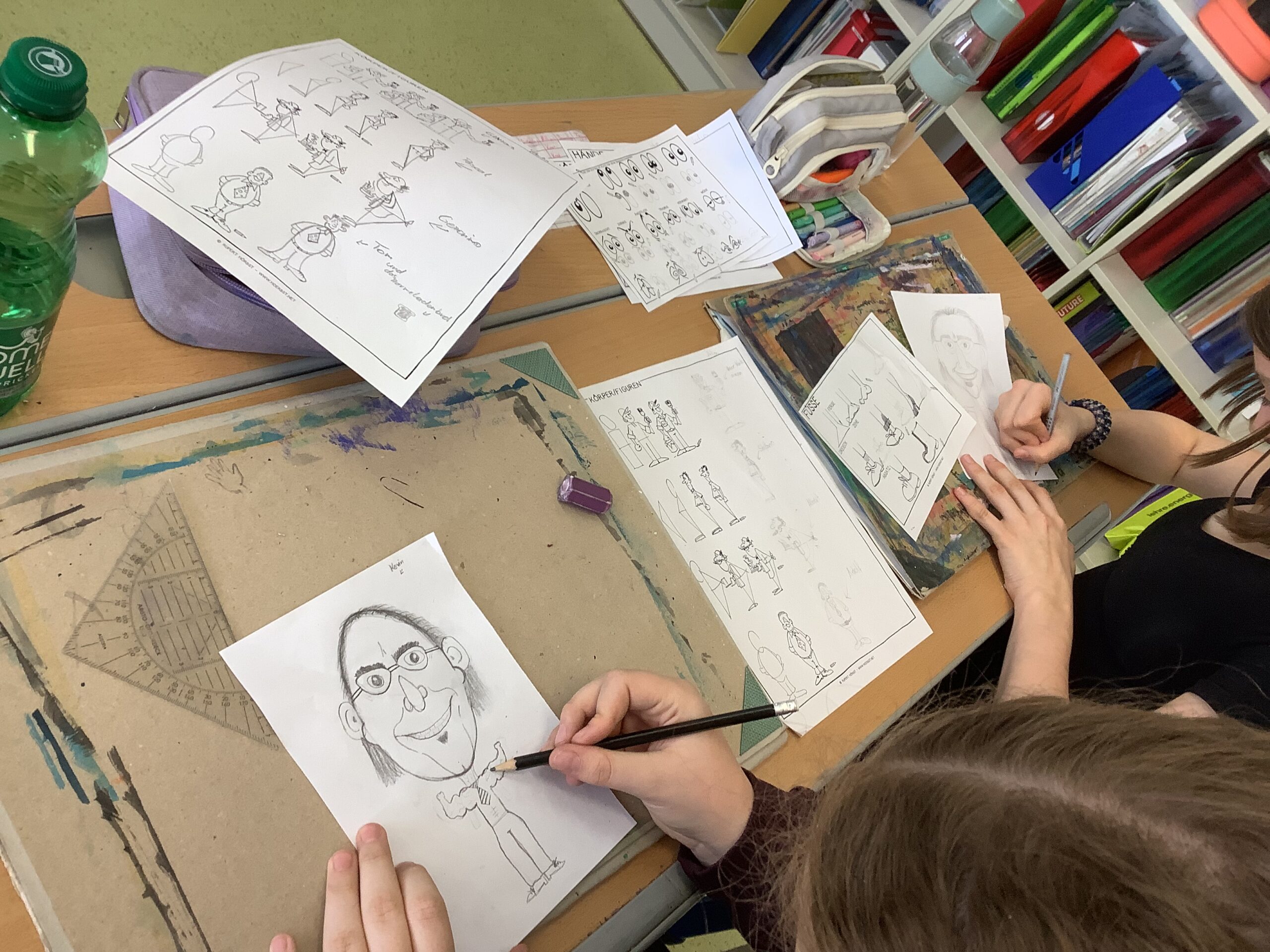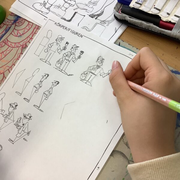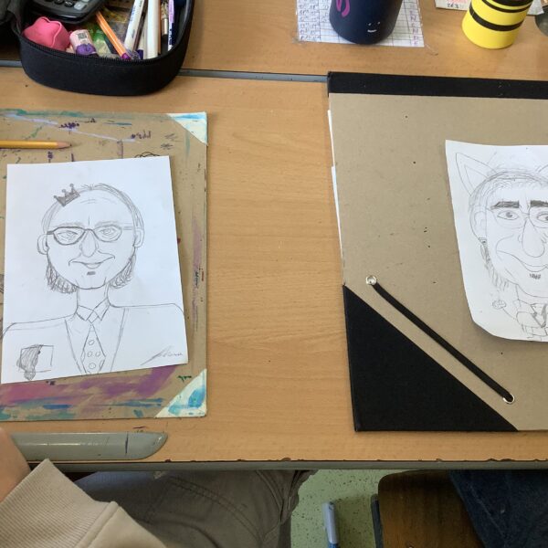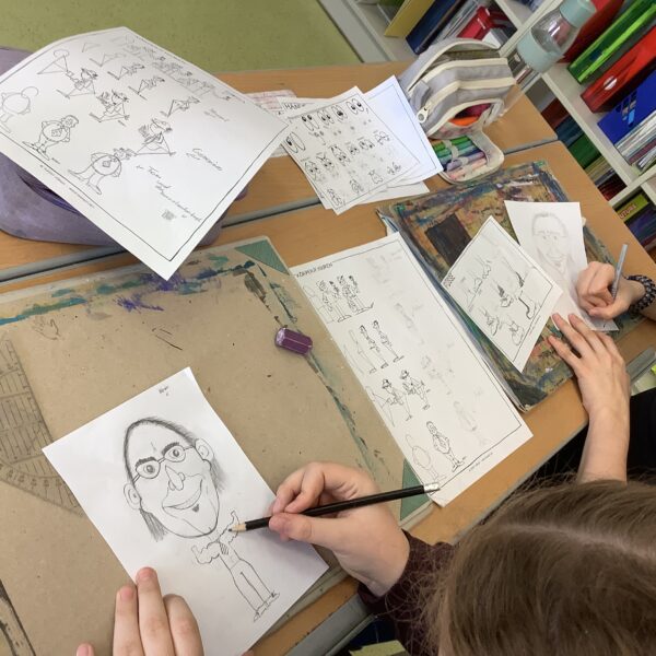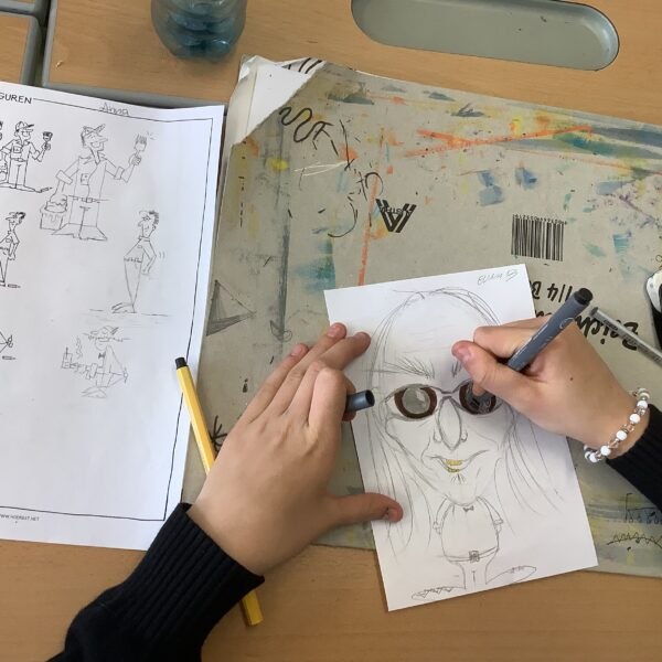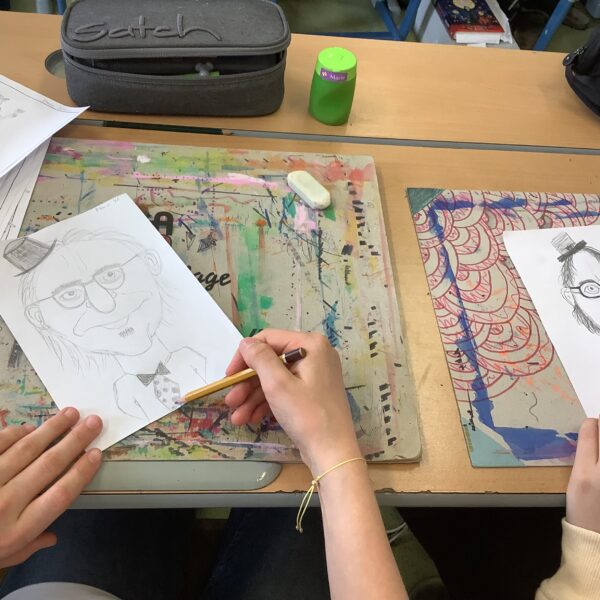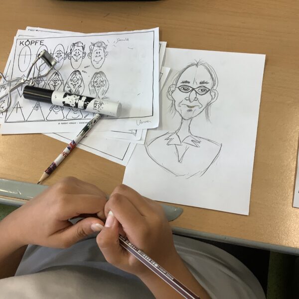 Portraitkarikatur und einer Karikatur mit persönlichem inhaltlichem Zugang dar. Die Schüler:innen hatten viel Spaß beim kreativen Schaffen.